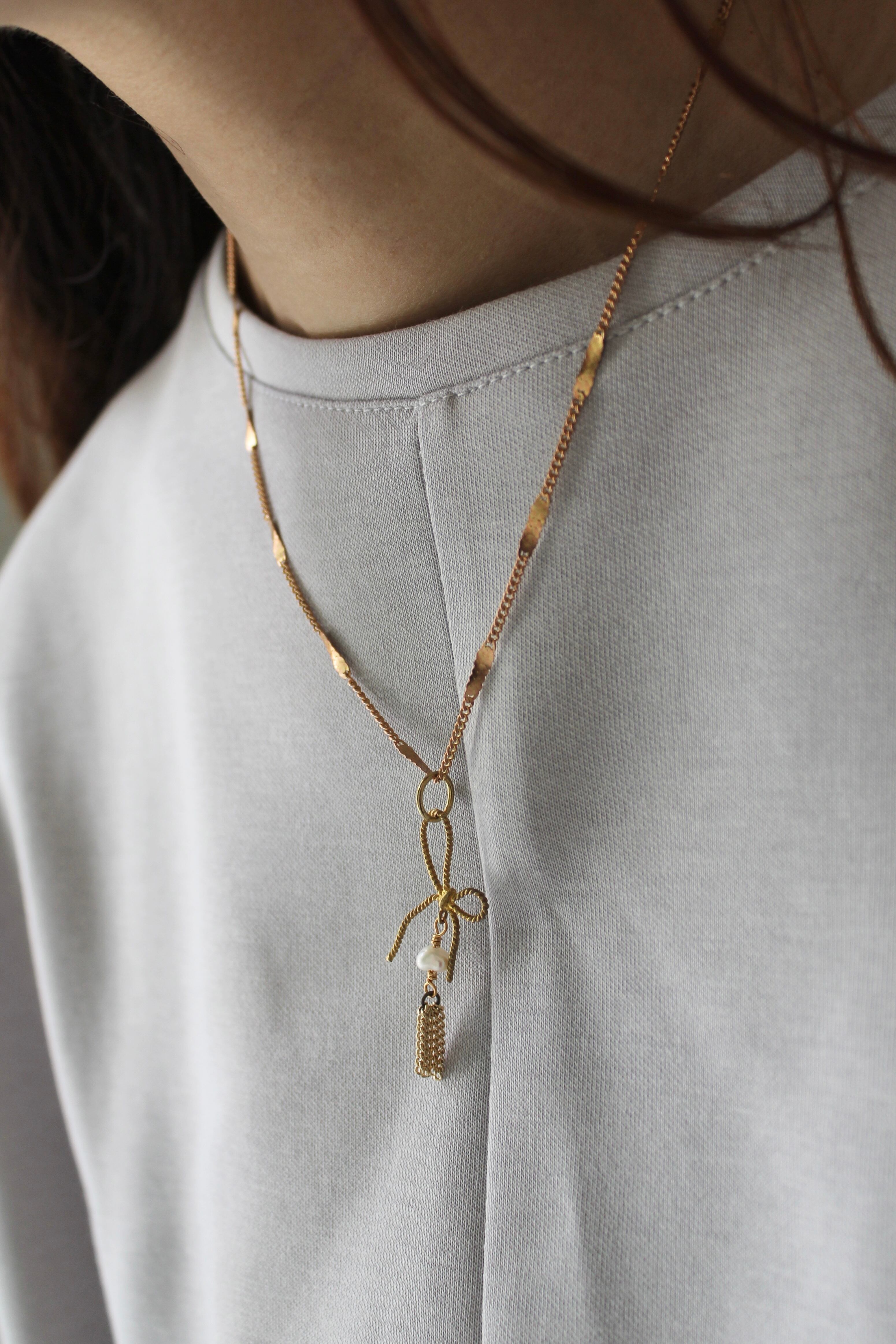 縄目の真鍮線でできたリボンに小粒の淡水パールと真鍮チェーンのタッセルを組み合わせました。