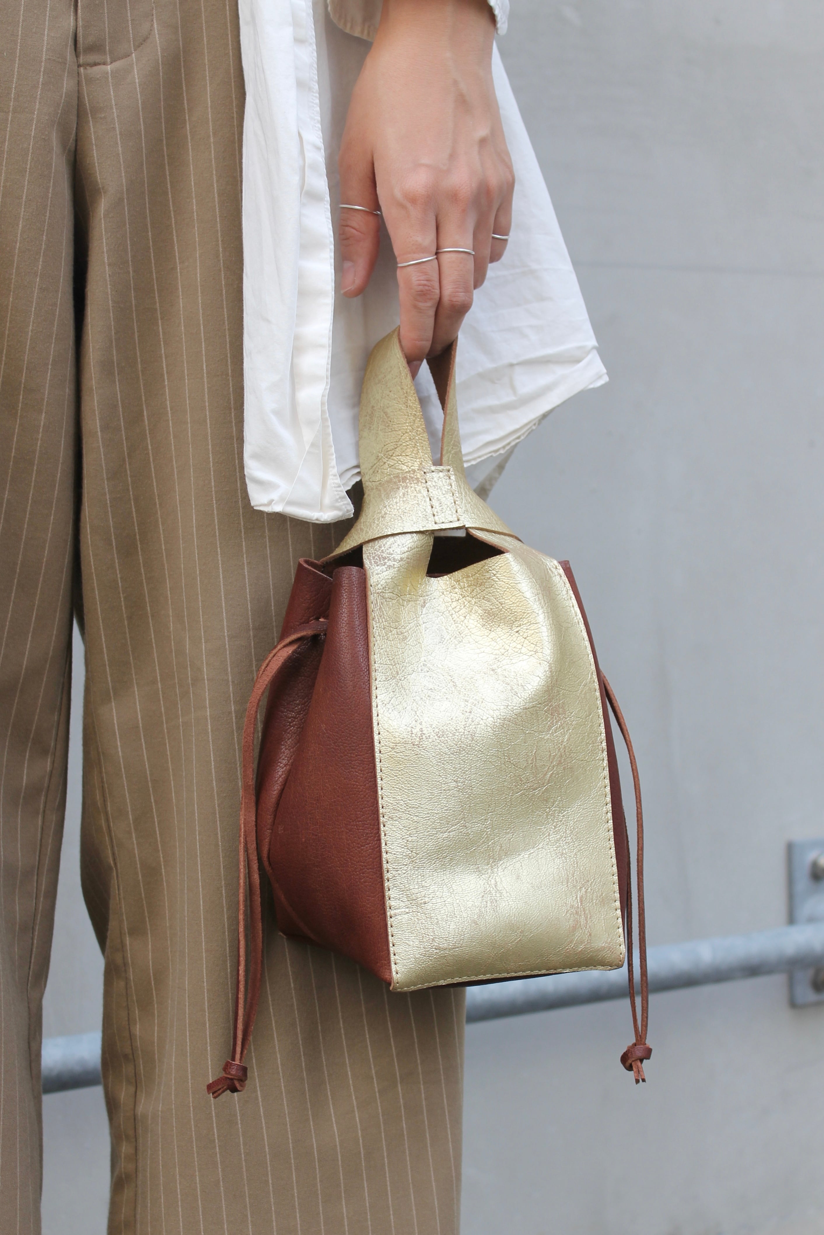 シルエットを変えられる、程よい抜け感のある巾着タイプのバッグです