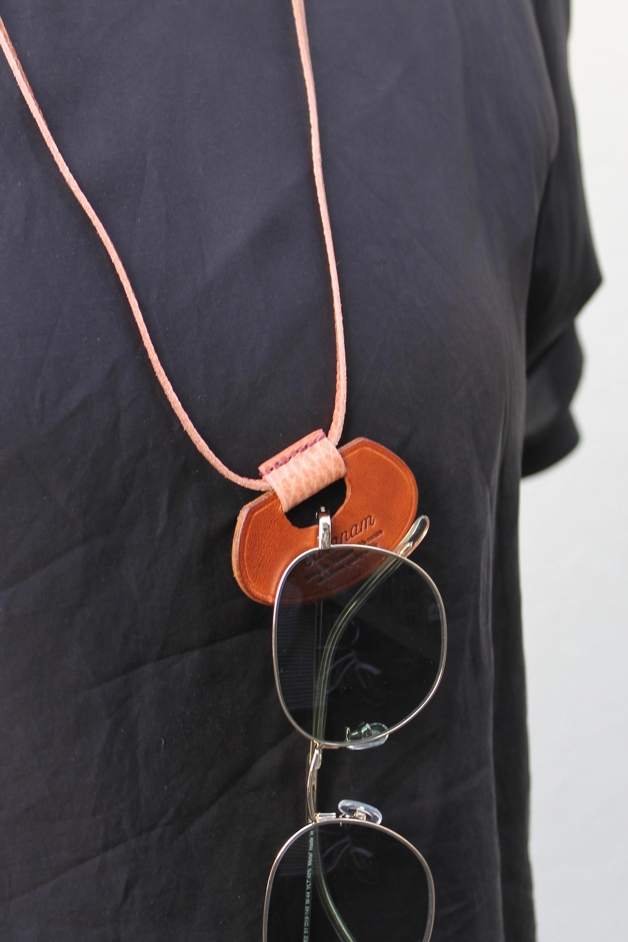 メガネを通すホールは2センチで、saranamのサイフなどで使用しているフラップのデザインを取り入れています