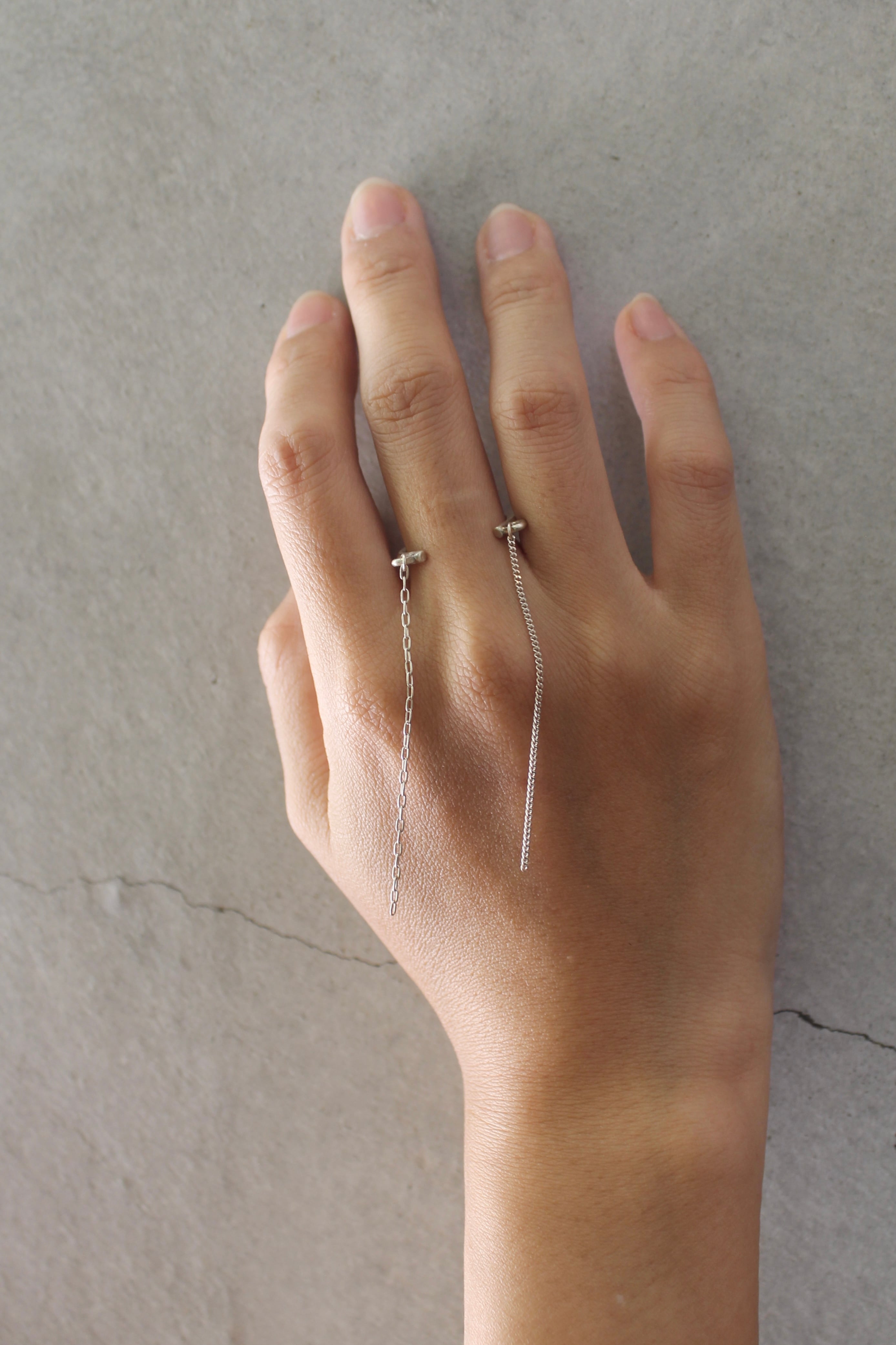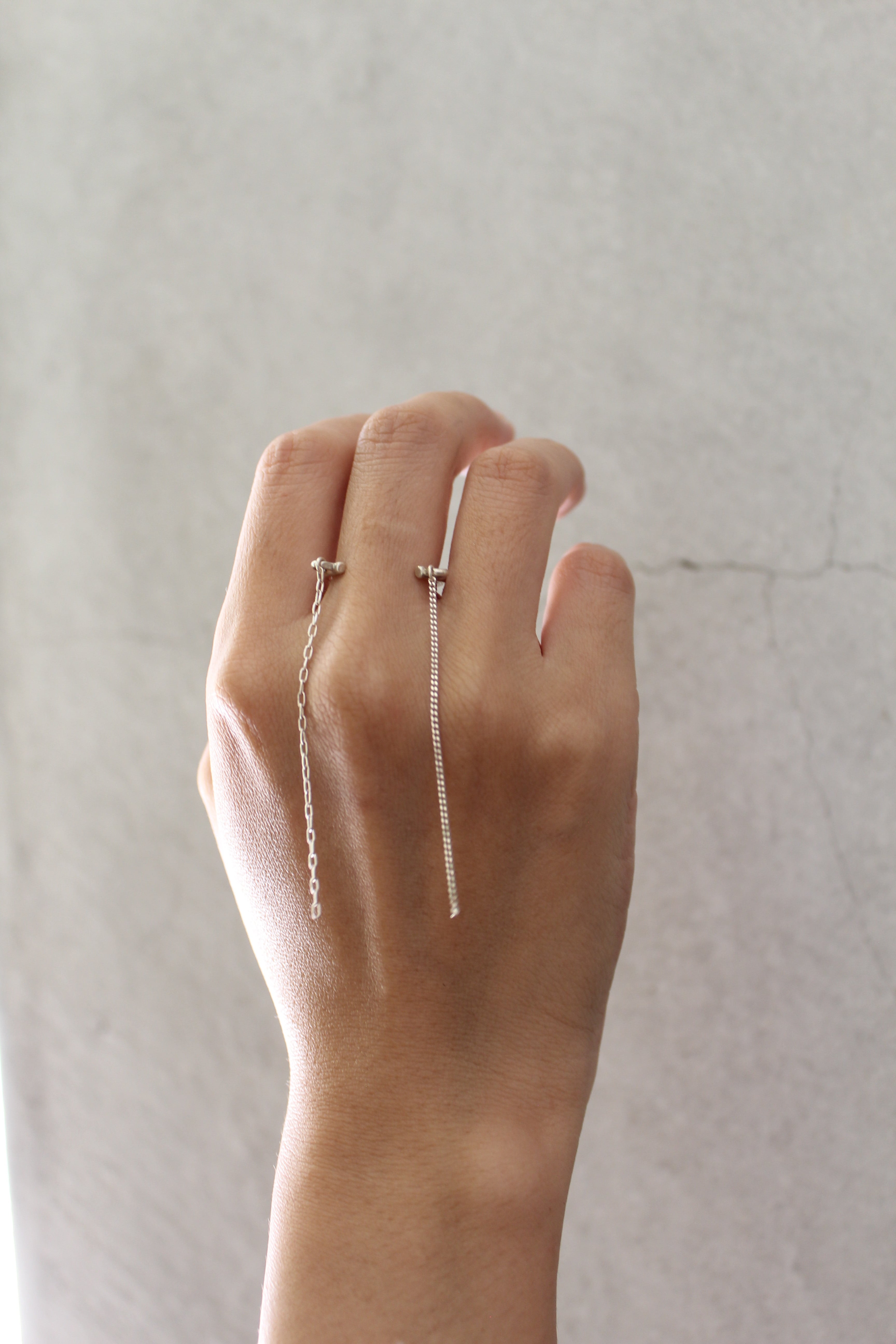 程よい太さのハンドルの両端からデザインの違ったチェーンを長めにとって、指と指の間から
