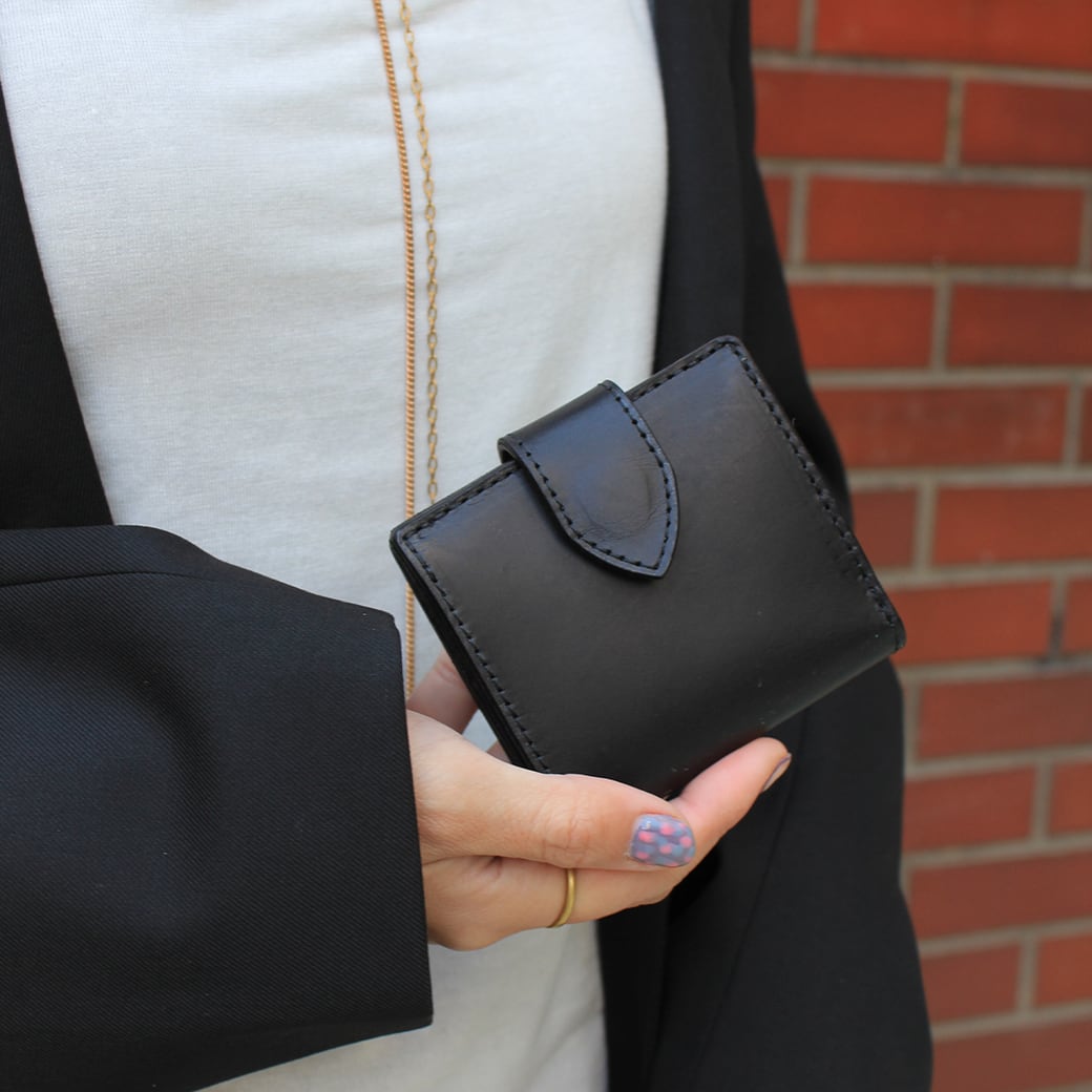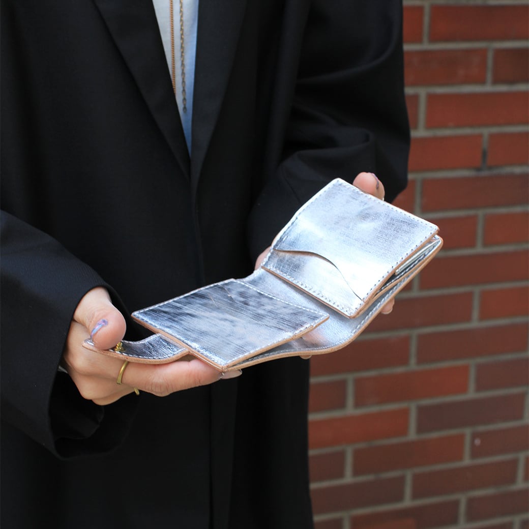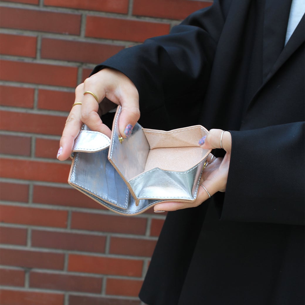 「正⽅形」をデザインのキーワードに仕上げた⼆つ折りのミニ財布です