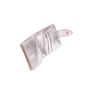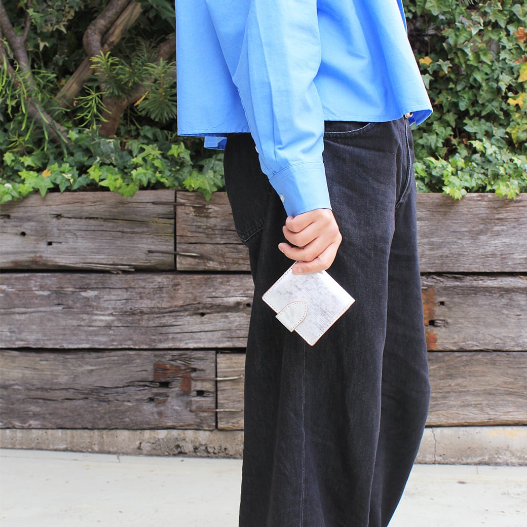 ・革の表面に金銀の箔を施し、更に手作業でやすりをかける事で独特のムラ感と光沢のある革です。お使いいただく中で少しずつ箔が擦れていき、本来の革の表情があらわれてきます。テープなどの粘着性のものに触れた場合、箔が剥がれてしまします。お取り扱いにはご注意ください。
