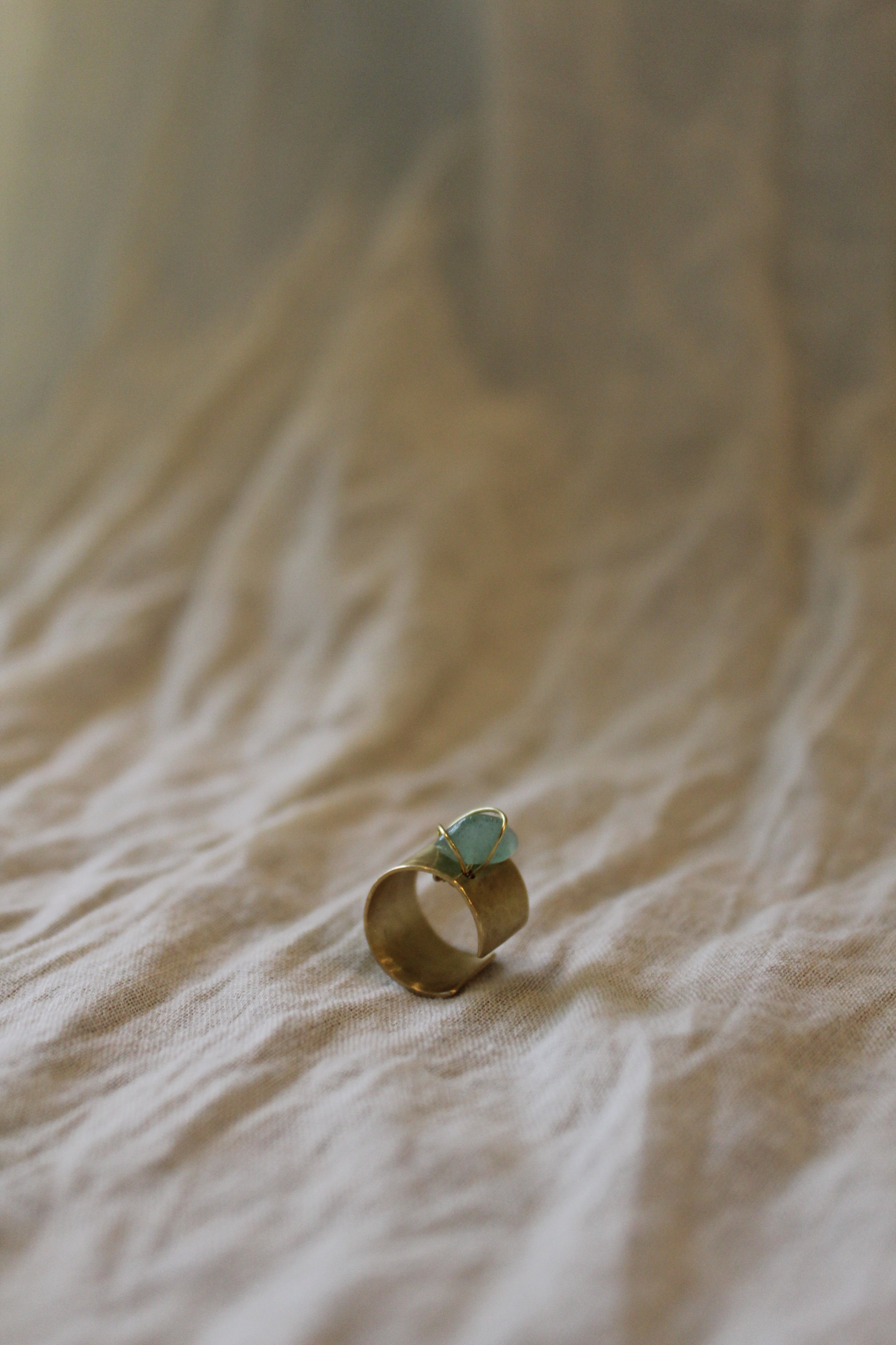 薄い真鍮板に不揃いな小粒のアベンチュリンを細い真鍮のワイヤーで巻きつけました。