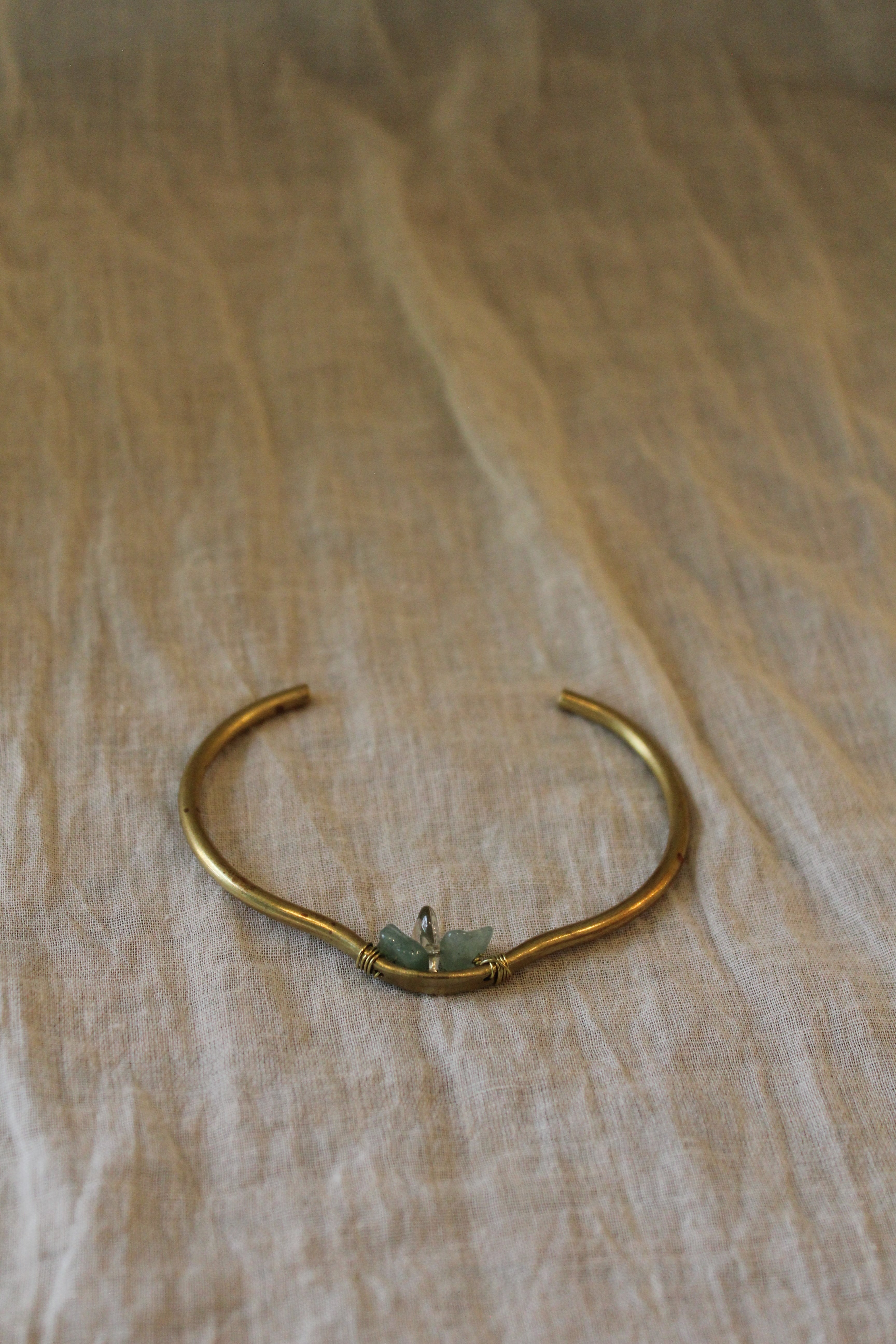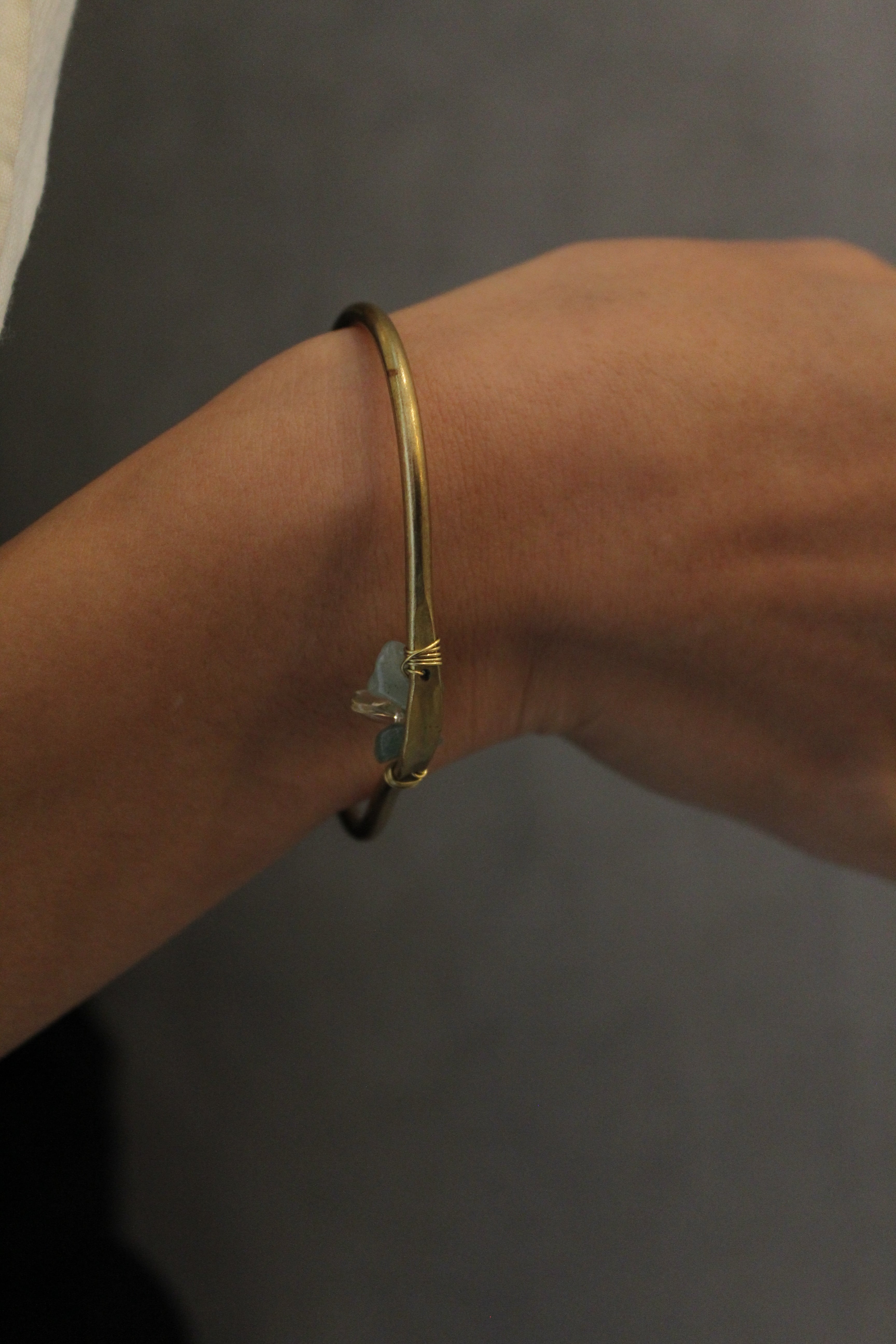 トップの天然石は、不揃いな小粒のアベンチュリンとレモンクォーツを組み合わせ真鍮線の内側に潜らせました。