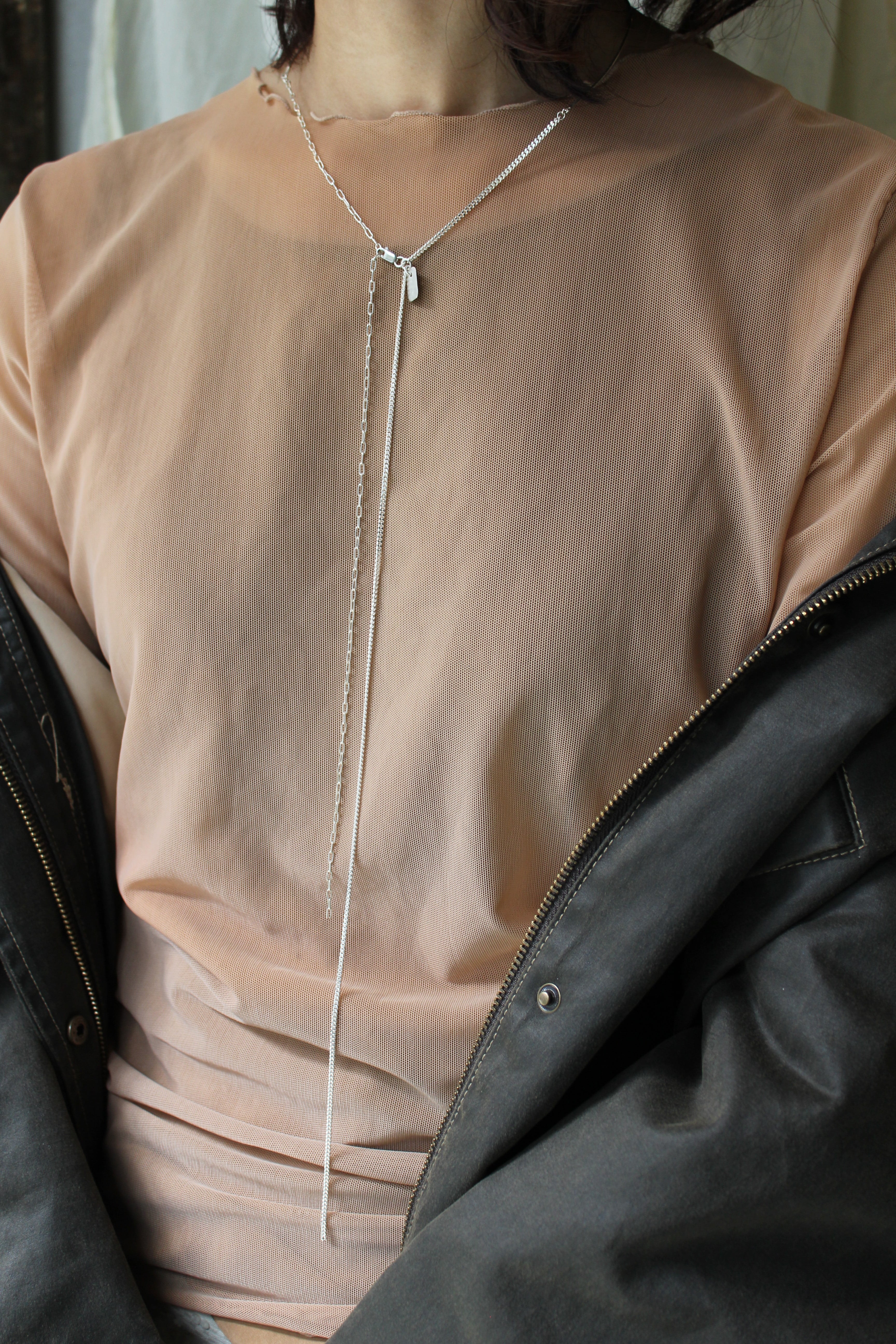 正面と後ろどちらでも使用でき、チェーンをあえて長めにとっているので、