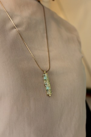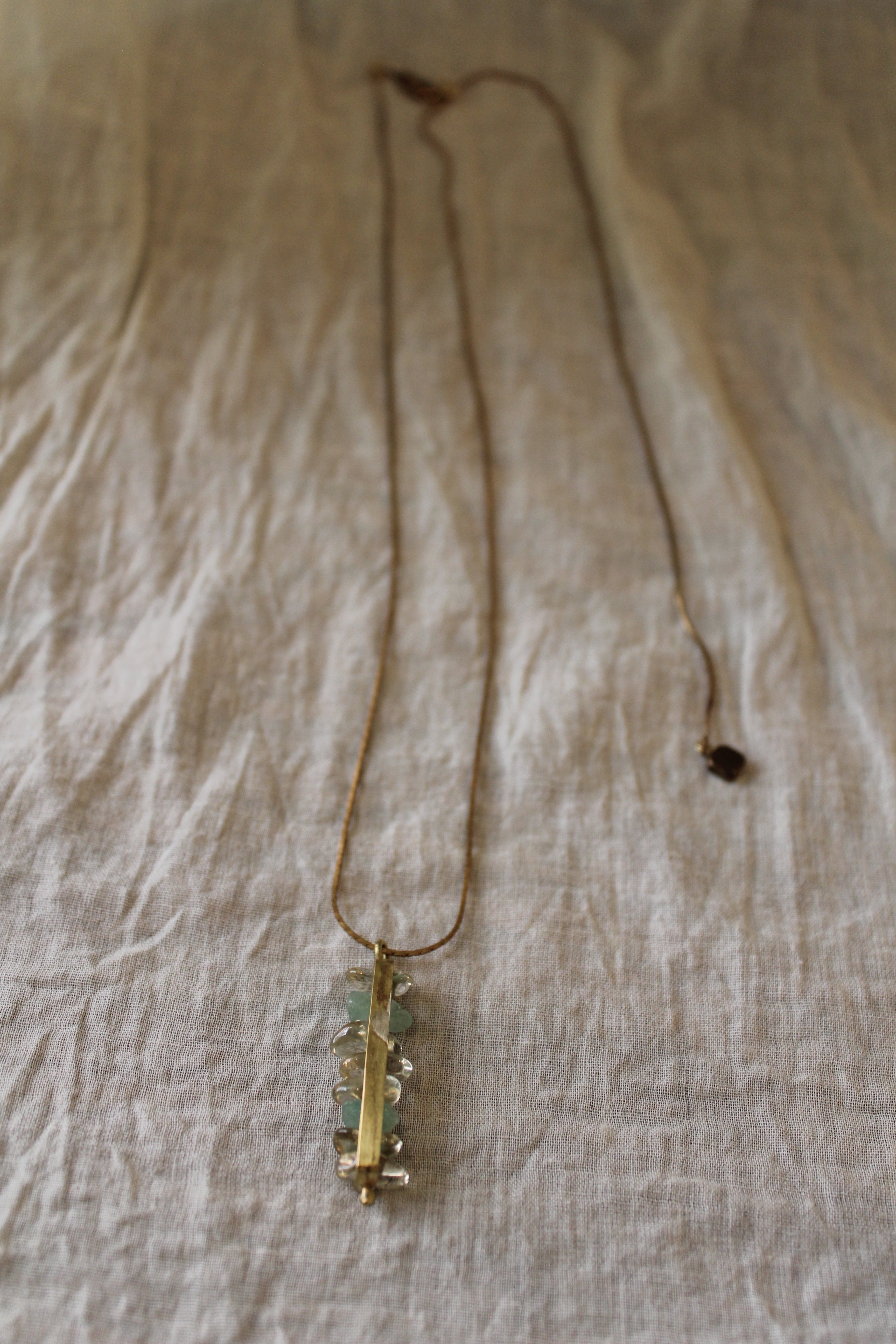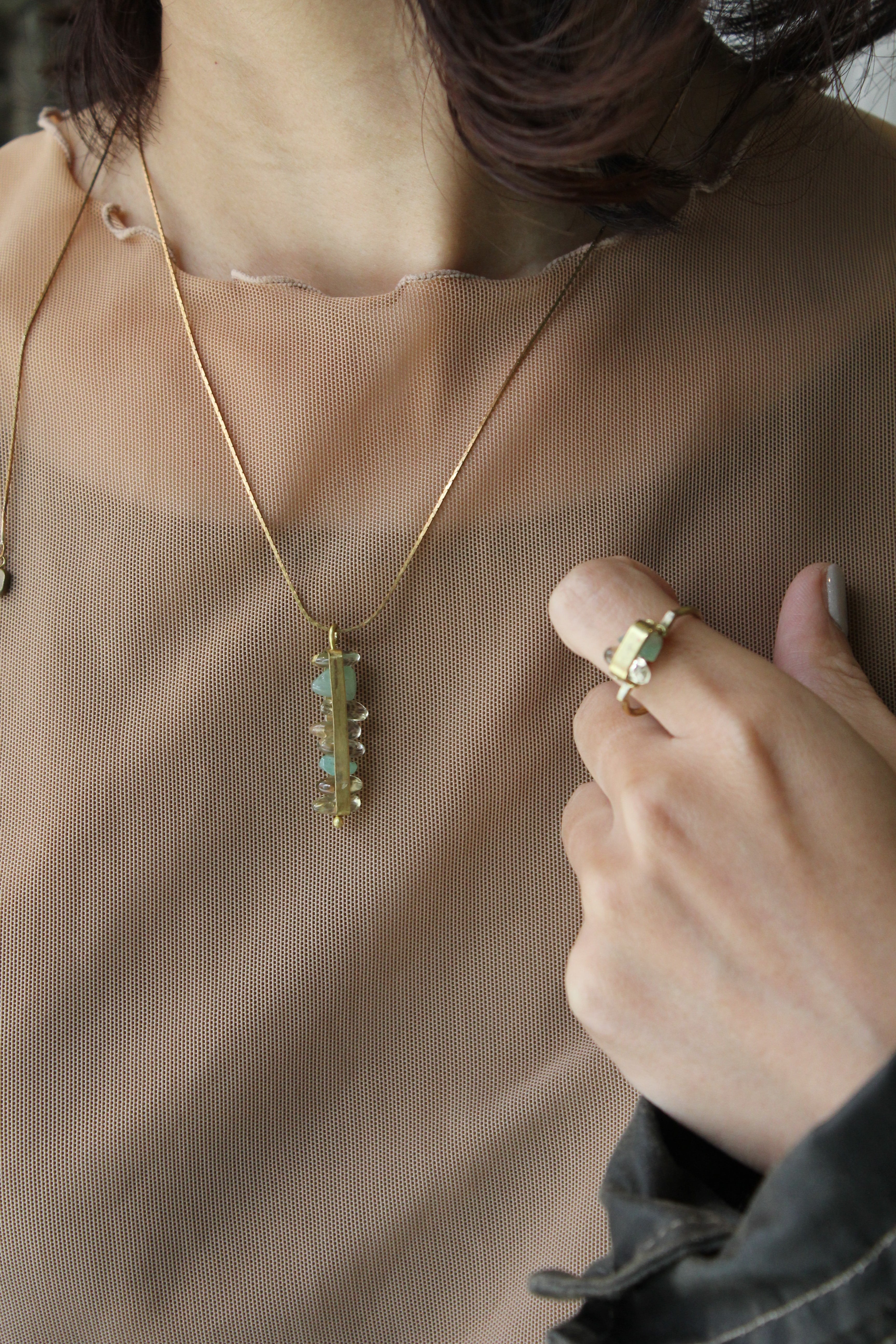 トップには、不揃いな小粒のアベンチュリンとレモンクォーツを組み合わせ真鍮の薄い板のバーで囲みました。