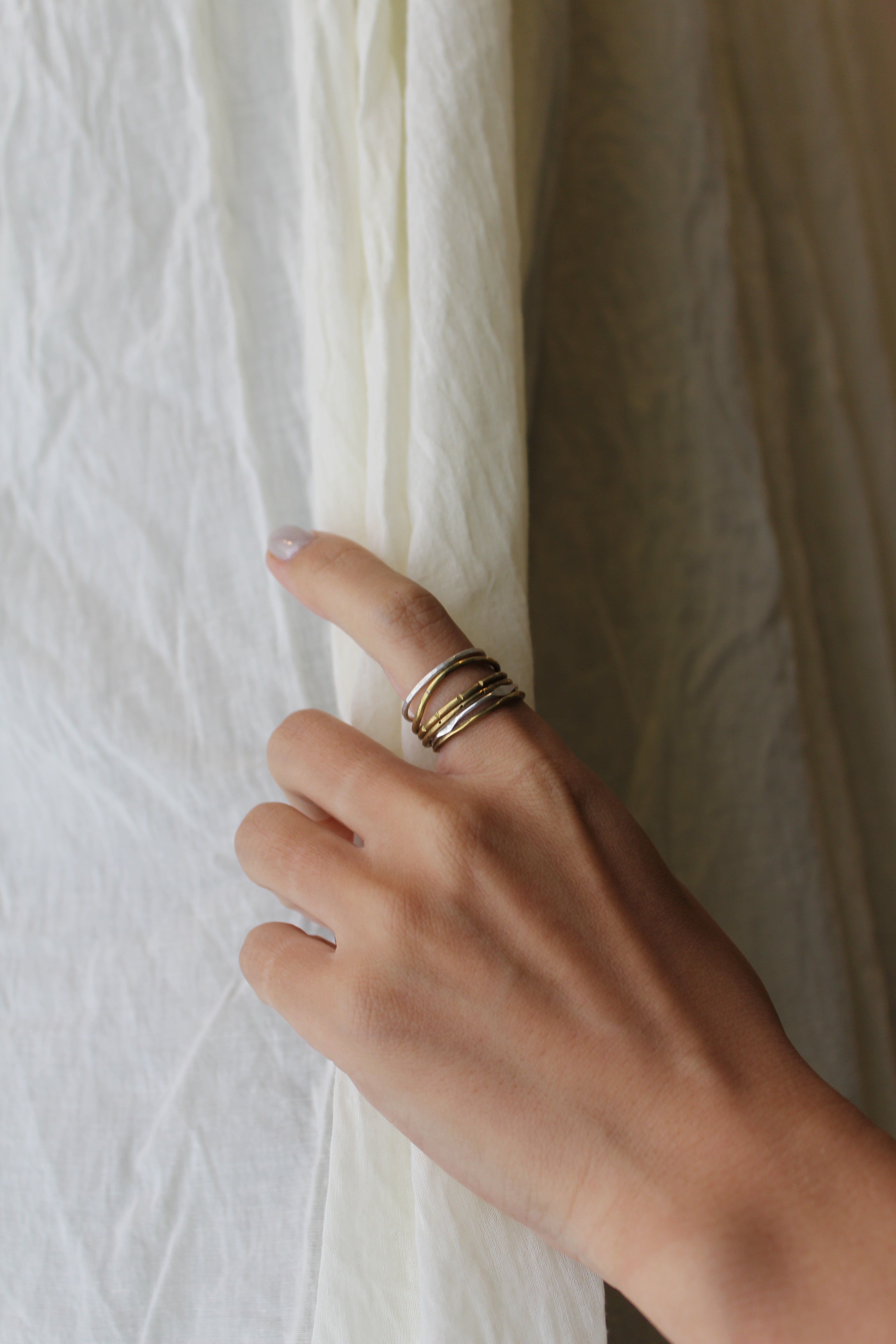 6本の細い丸線のリングが真鍮とシルバーのMIXでセットになっています。