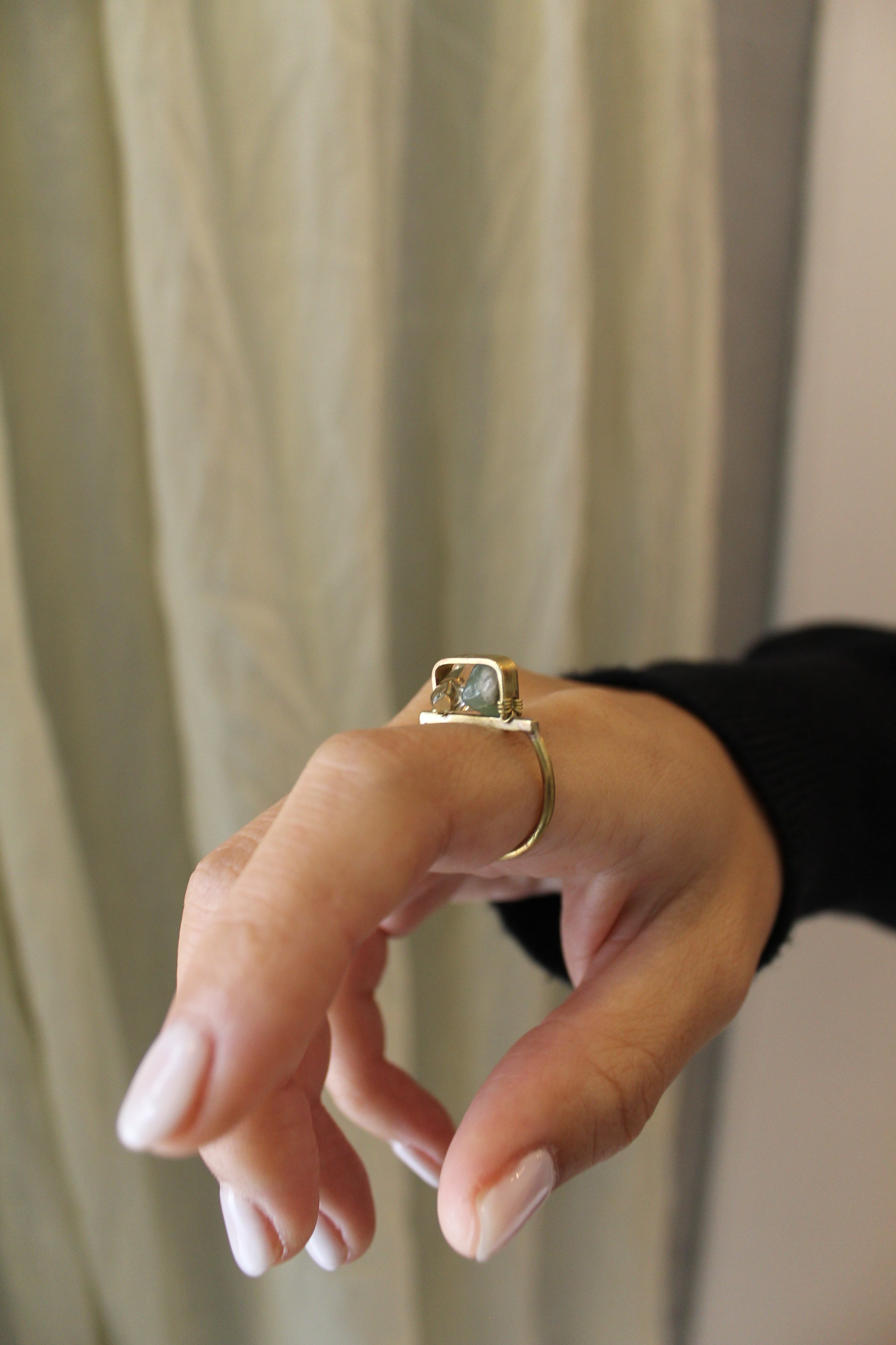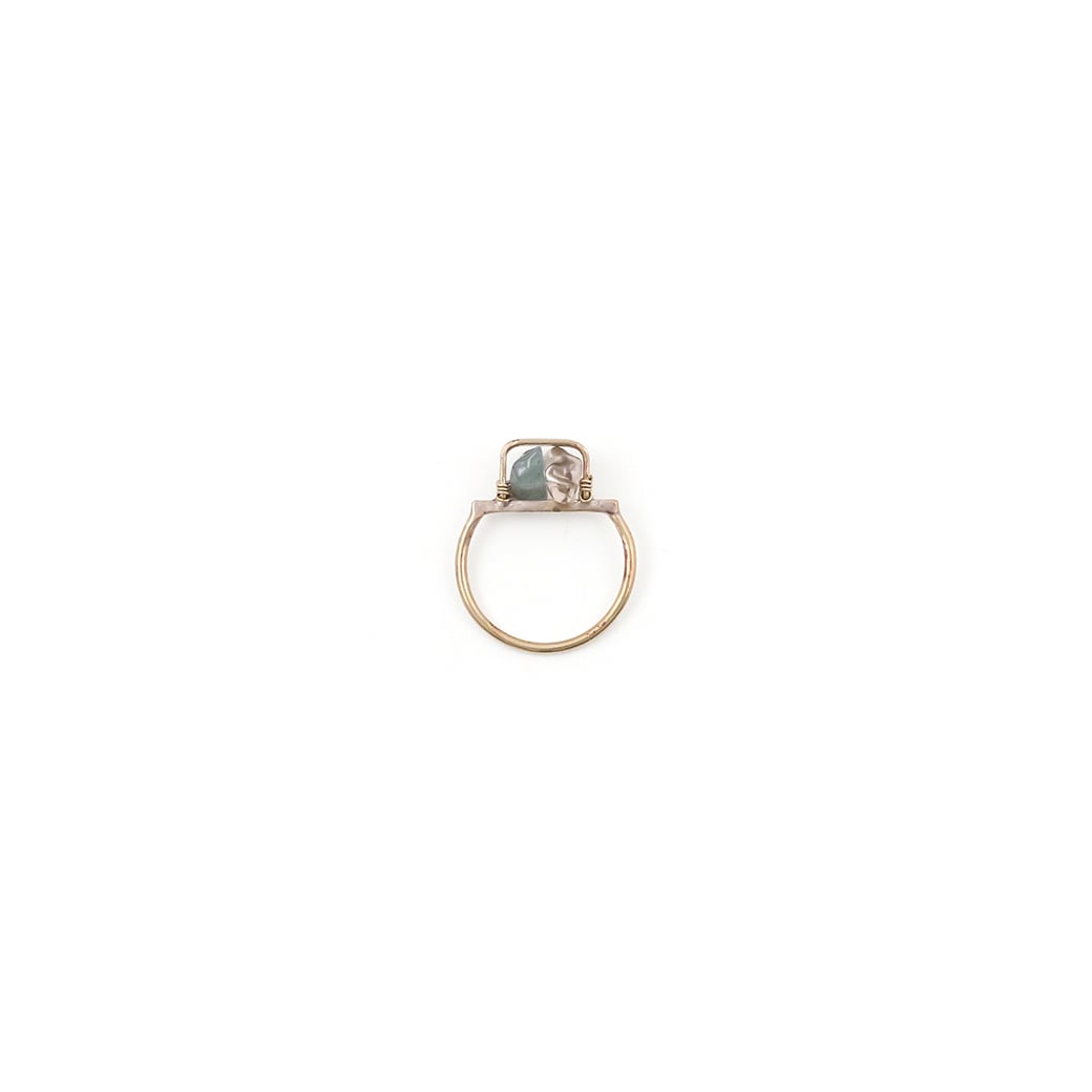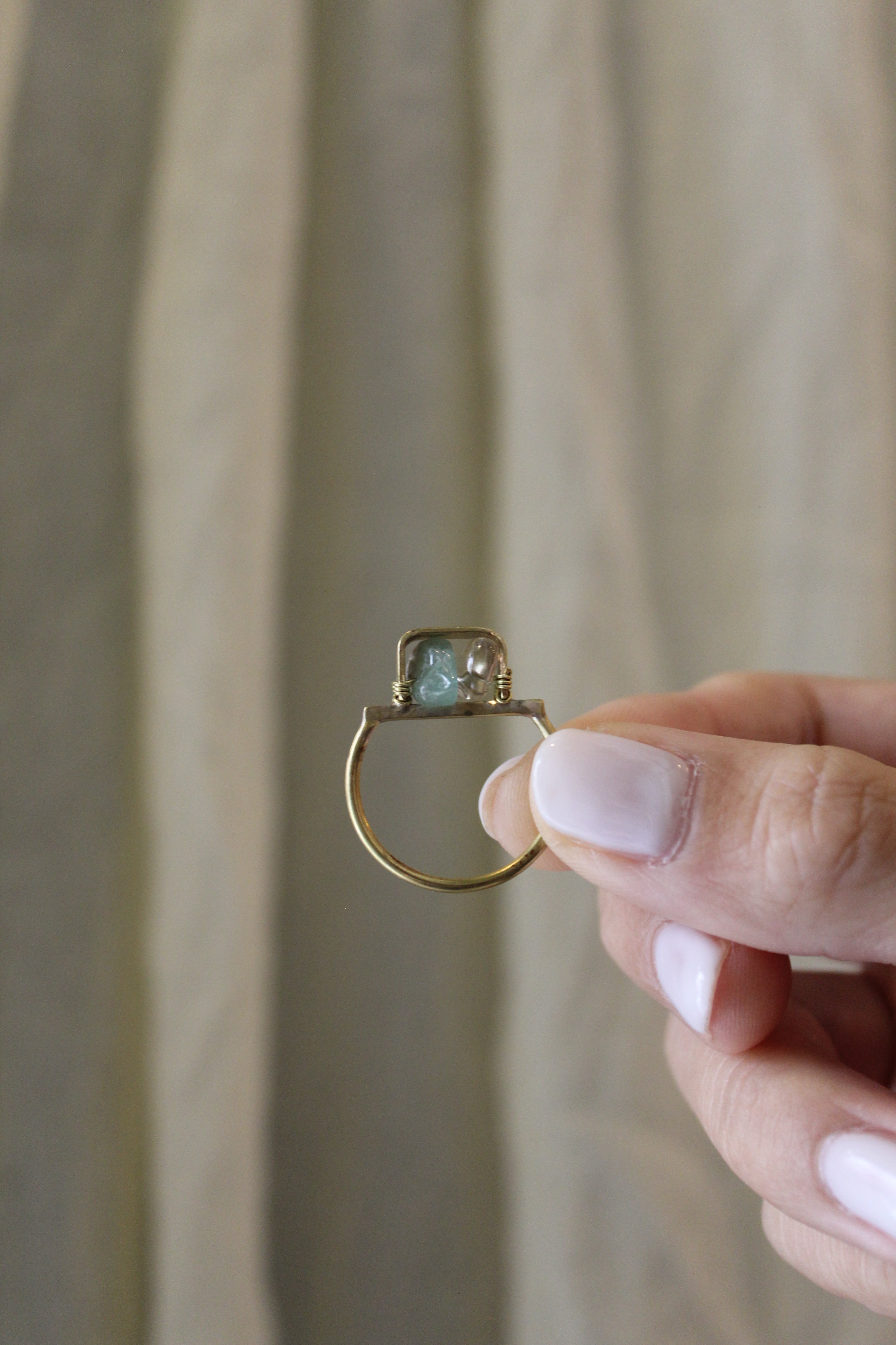トップには不揃いな小粒のアベンチュリンとレモンクォーツを組み合わせ真鍮板の枠に潜らせました。