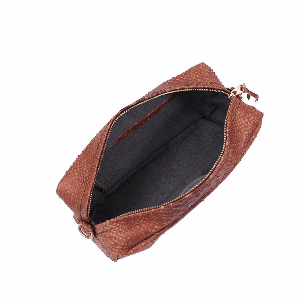本体はヘビのウロコ感がある個性的な型押しのタンニンレザーを使用しています。