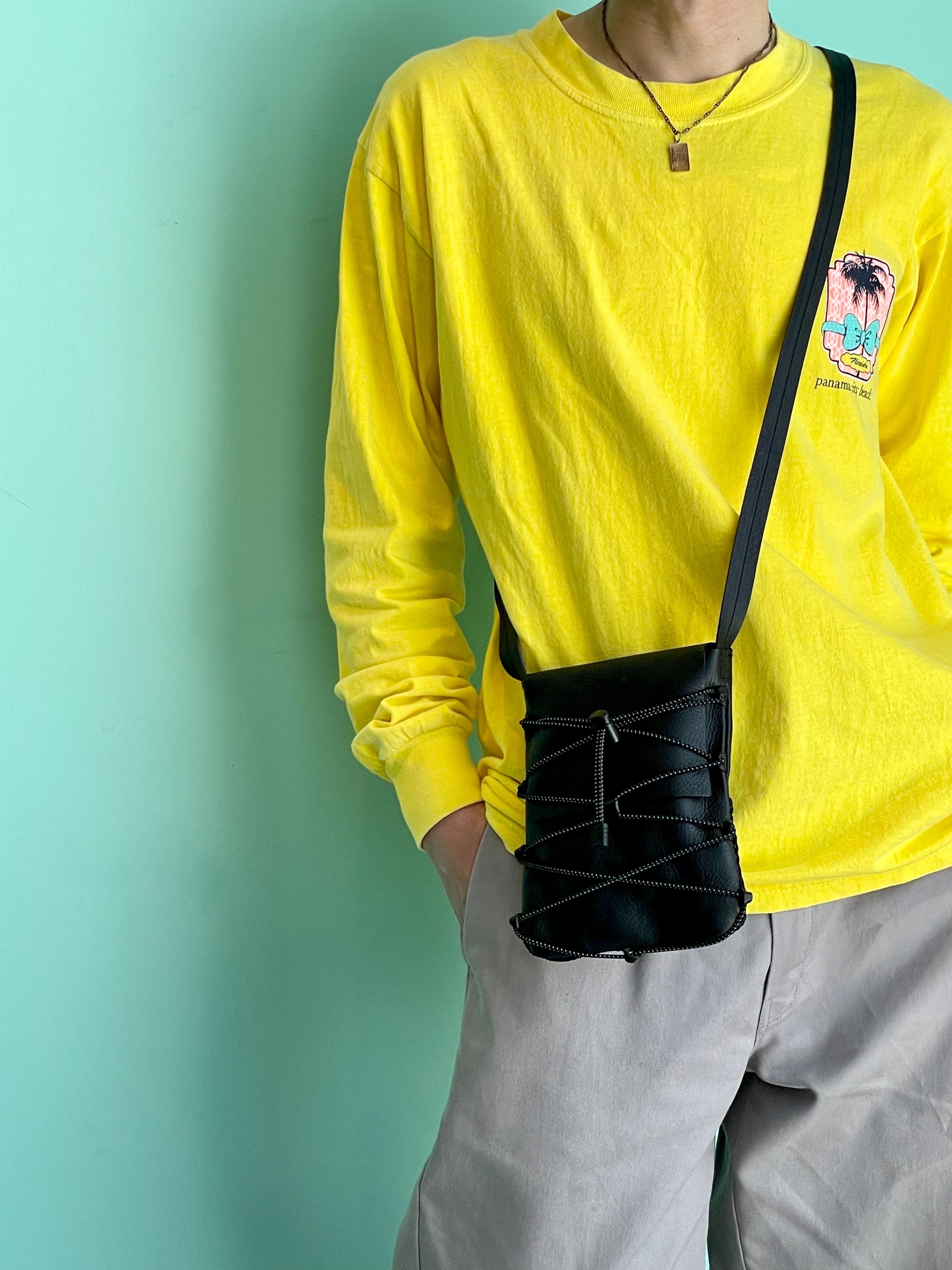 小ぶりなショルダーバッグで、フロントの伸縮性のあるドローコードは挟んで固定する収納になっています。