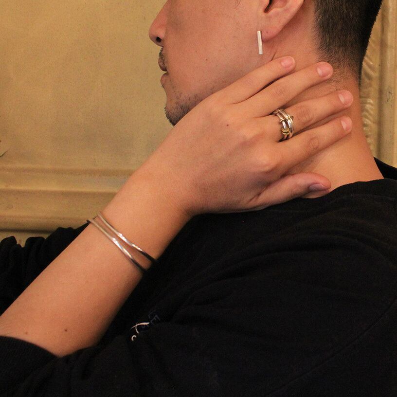 端の2ミリの丸線のリングにはインドで買い付けてきたビーズを通し動きがありアクセントになっています。