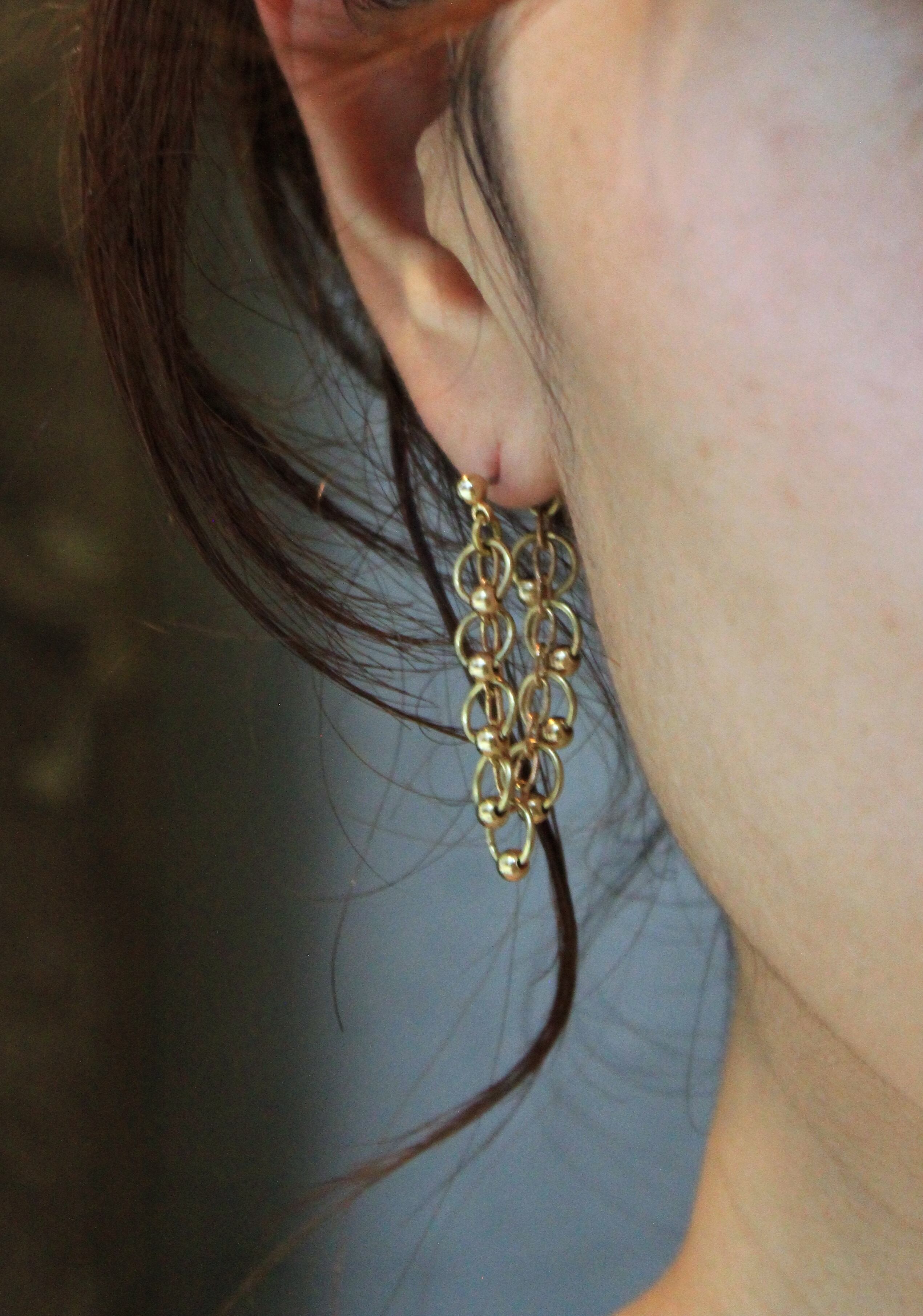 飾りのついたチェーンをトップからキャッチにつなげて耳たぶの下をぐるりと潜るような仕様になっています。